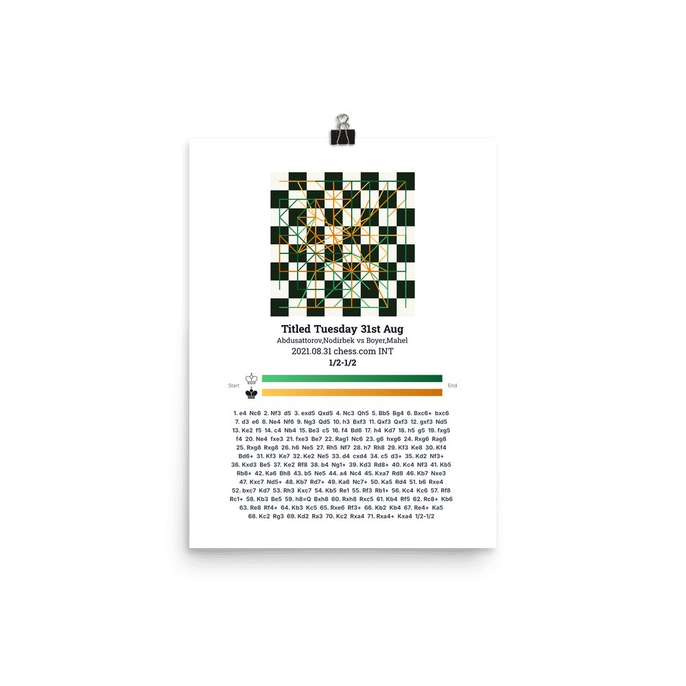 Museum-quality poster on thick, durable matte paper. A sharp, clean look for any chess visualisation.