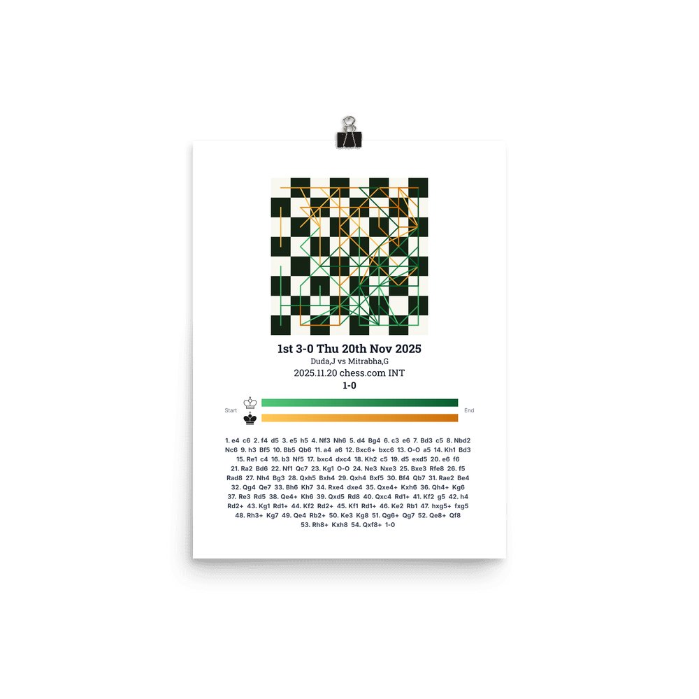 Museum-quality poster on thick, durable matte paper. A sharp, clean look for any chess visualisation.