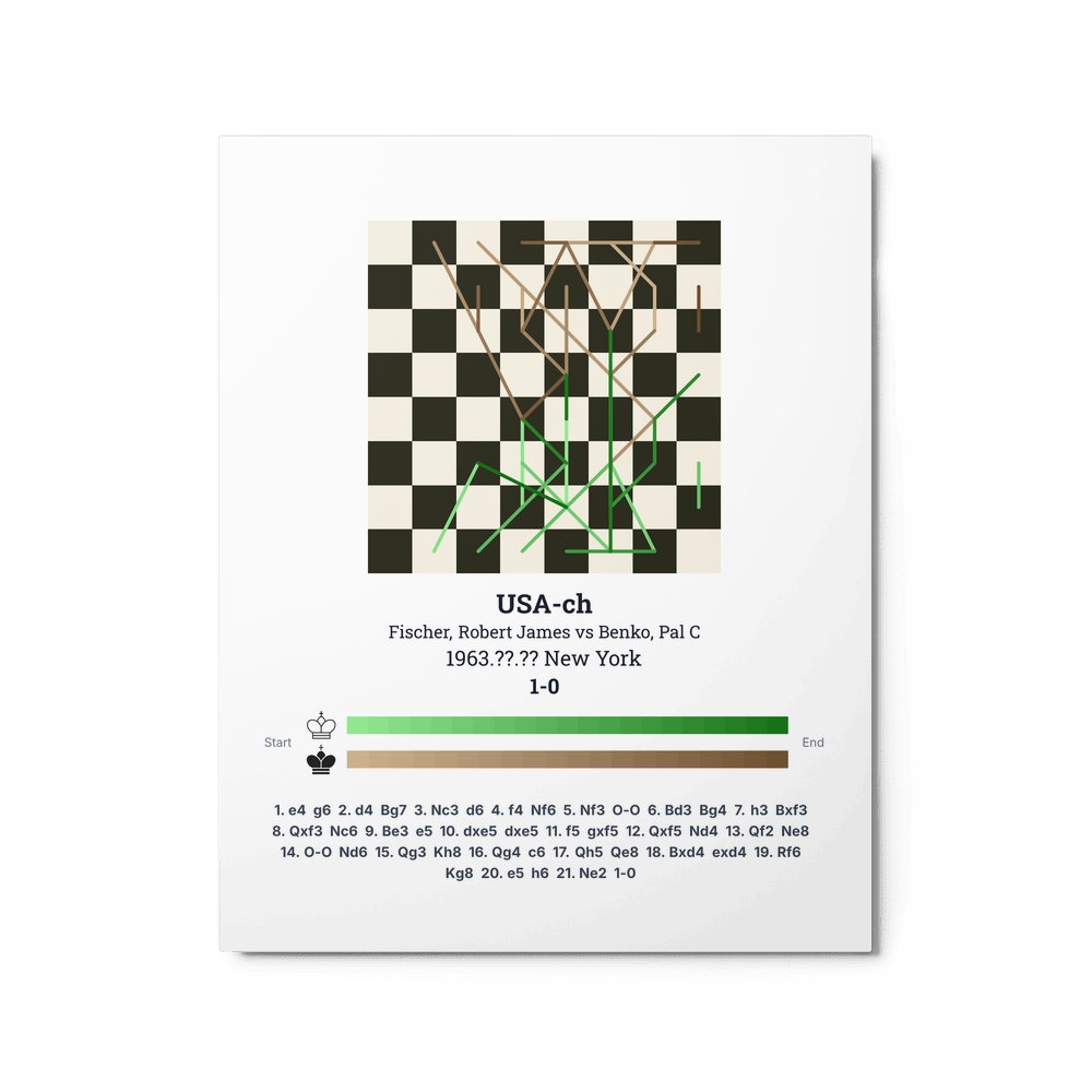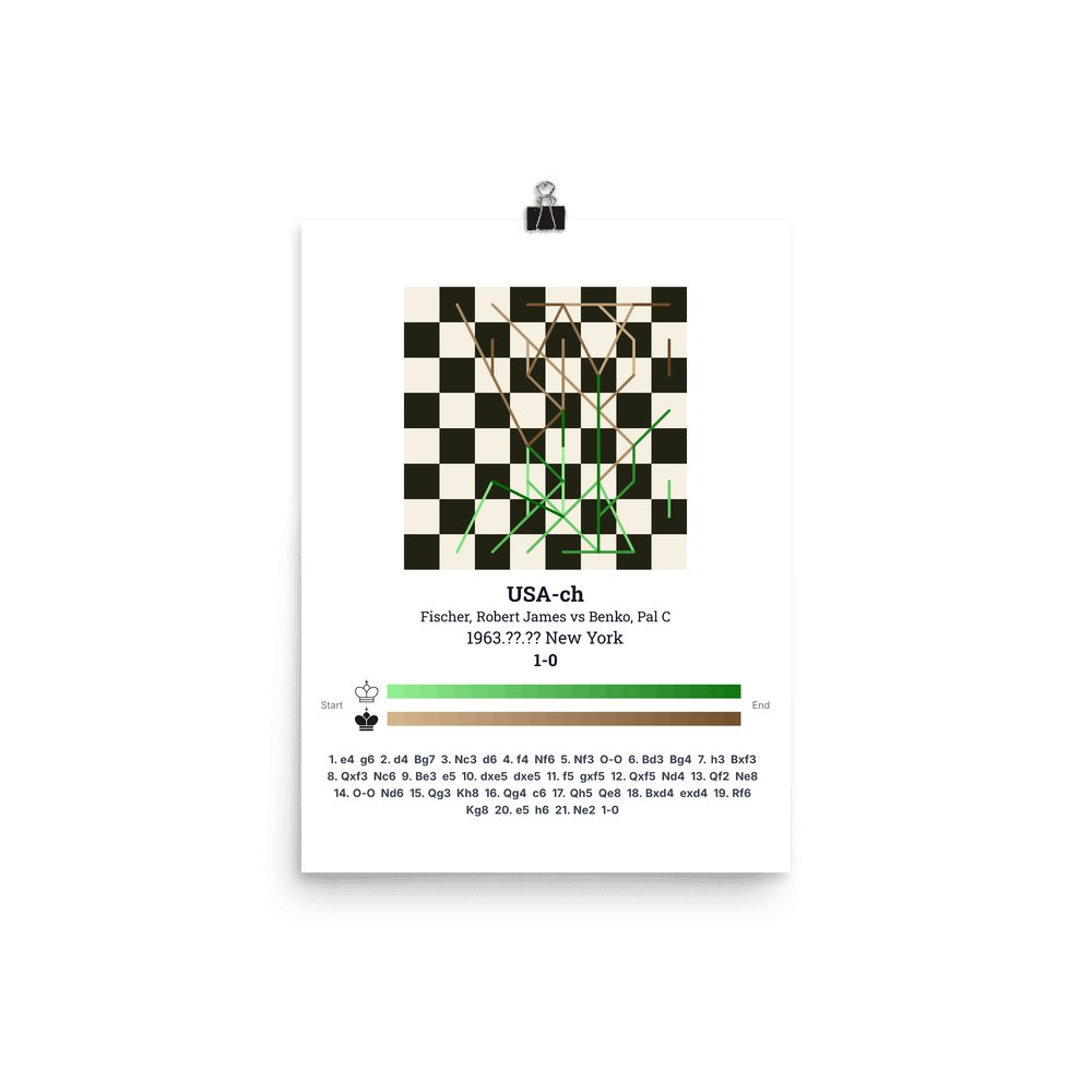 US Championship 1963. Part of Fischer's legendary 11-0 sweep of the US Championship — one of the most dominant tournament performances in history. His play against Benko demonstrated the effortless precision that defined his style.