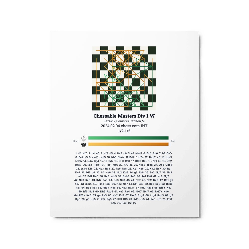 Museum-quality poster on thick, durable matte paper. A sharp, clean look for any chess visualisation.